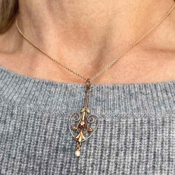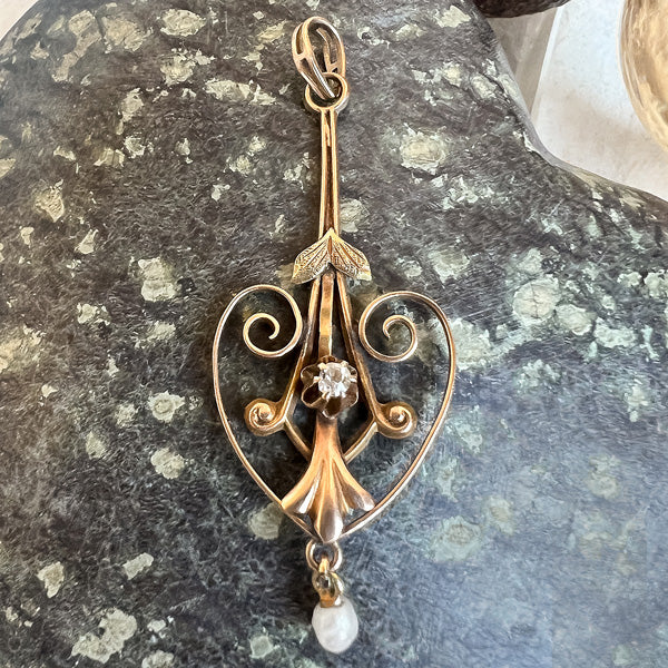Measuring approx. 1 3/4 x x 5/8 inch, centering a Single cut diamond weighing approx. 0.05ct., suspending a pearl measuring approx. 2.7mm., fashioned in 14k yellow gold.