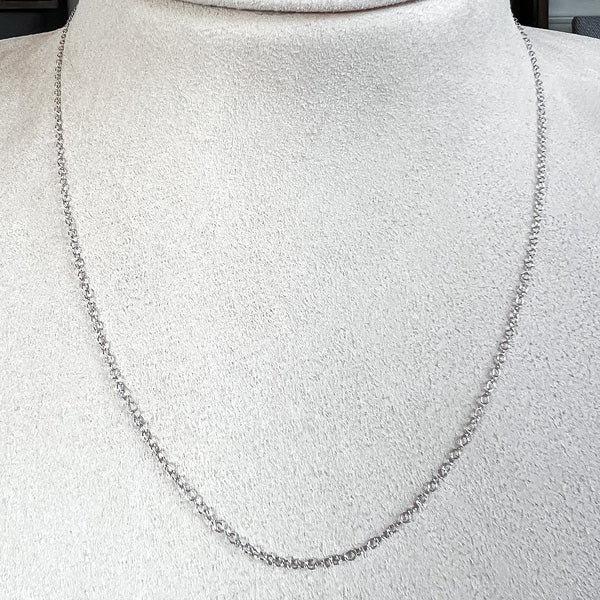Measuring approx. 1mm wide, fashioned in 14k white gold. Length 16 or 18 inches.