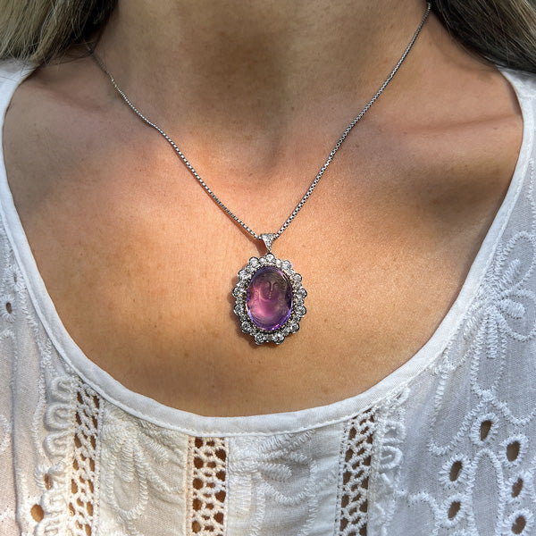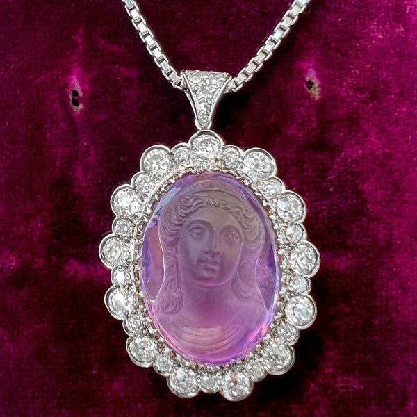 Centering an amethyst cameo measuring approx. 19 x 14 mm., framed by twenty-six Old Mine cut diamonds weighing approx. 1.57ctw., and eight Single cut diamonds weighing approx. 0.08ctw., fashioned in 18k white gold and platinum. Suspended from a box link chain fashioned in white gold. Length 18 inches.