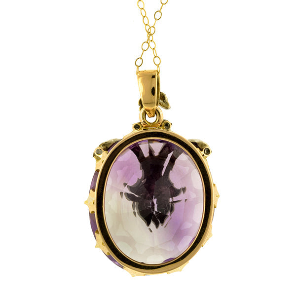 Featuring a prong set oval faceted amethyst measuring 23.5 x 20.25 x 13.15mm, with an approx. weight of 33.17ct.; along with eighteen Rose cut diamonds ranging in size from approx. 1.50 to 2.20mm. Suspended from 16 inch 14k gold chain. Fashioned in 14k yellow gold and silver.