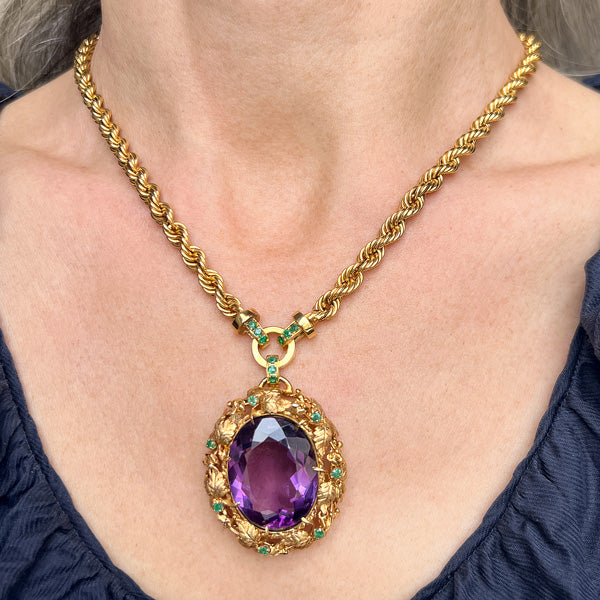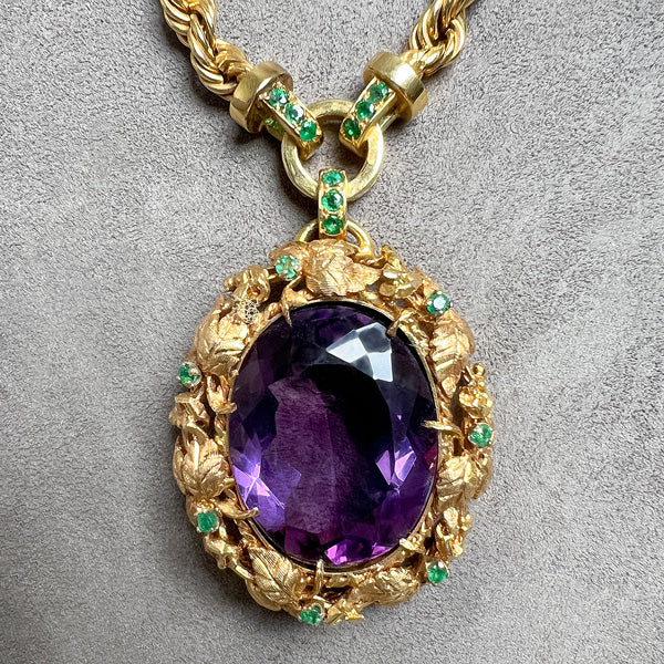 Pendant drop measuring approx. 1 7/8 x 1 5/16 inches, centering an oval faceted amethyst measuring approx. 27 x 21 mm., in a leaf motif frame set with seven Round faceted emeralds measuring approx. 2mm., on a bail set with three round faceted emeralds measuring approx. 2mm. On a rope chain measuring approx. 18 1/2 inches. with ends set with six round faceted emeralds measuring approx. 2mm. Stamped 14K & PAT 3308517.