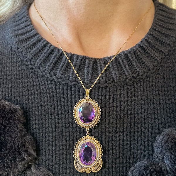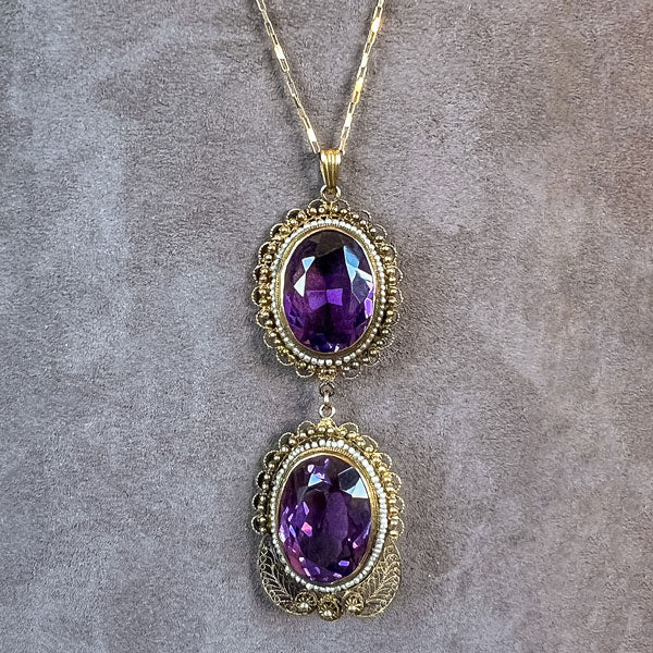 Measuring approx. 2 5/8 inches in length, set with two oval faceted amethysts measuring approx. 27 x 13mm, framed by seed pearls on wire and within cannetille frames, fashioned in 14k yellow gold. Stamped 14K. On a rectangular link chain, measuring approx. 1mm wide, fashioned in 14k yellow gold. Stamped 14k milor. Length 18 inches.