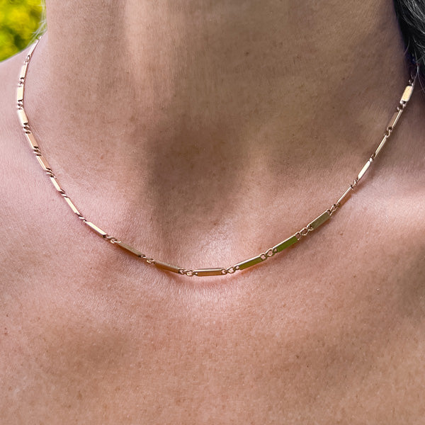 Measuring approx. 2.3mm wide with bar links, fashioned in 14k rose gold. Length 16 1/2 inches. Austro-Hungarian hallmarks.