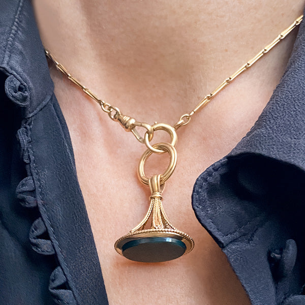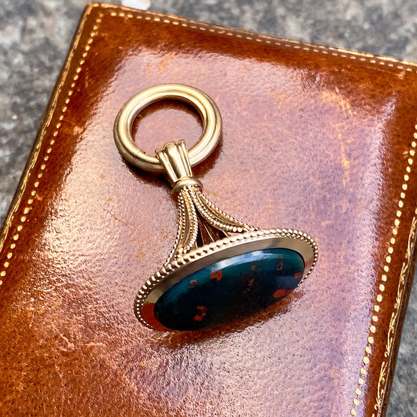Measuring approx. 1 1/2 x 15/16 inches, set with an Oval bloodstone tablet measuring approx. 19 x 13 mm., fashioned in 14k yellow gold.