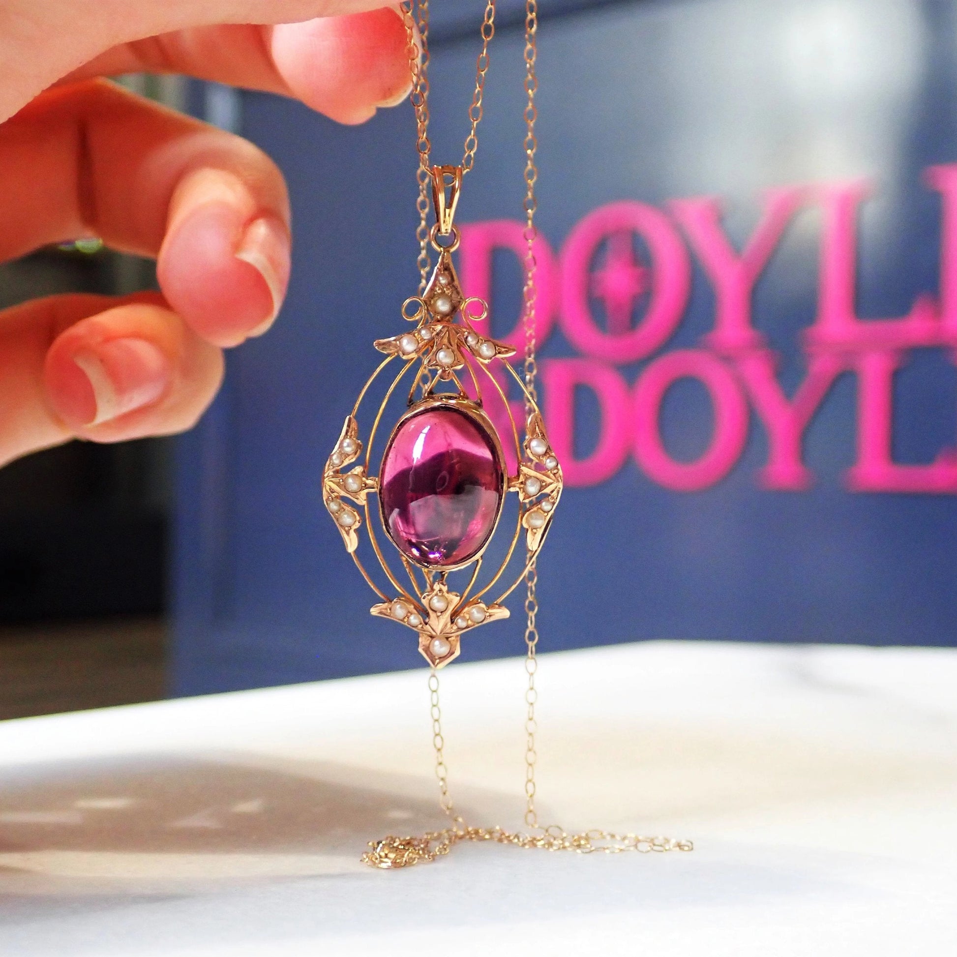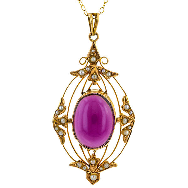 Centering an oval cabochon garnet measuring approx. 13.5 x 10 mm., within an open work frame with embellished with foliate motifs set with twenty-three half pearls ranging in size from 1-1.7mm suspended from 16 inch chain, fashioned in 10k yellow gold.