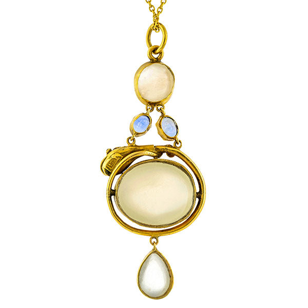 Suspending an oval cabochon cat's eye moonstone measuring approx. 9 x 8 mm, suspending two cushion faceted sapphires 5.5 x 4 mm, further suspending an oval cabochon cat's eye moonstone measuring approx. 17 x 13.5 mm framed by a snake & terminating a pear shaped cabochon cat's eye moonstone measuring approx. 9.5 x 6.5 mm., fashioned in 15k. Stamped 15CT. Length 2 1/4. Circa 1880.