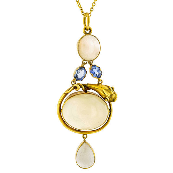 Antique Cat's Eye Moonstone & Sapphire Snake Pendant