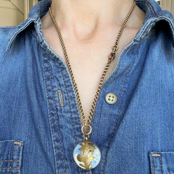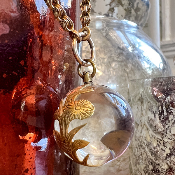 A sphere of undrilled rock crystal encircled in a floral and foliate mounting fashioned in brass, suspended from an antique chain measuring approx. 22.5 inches in length, fashioned in 14k yellow gold.