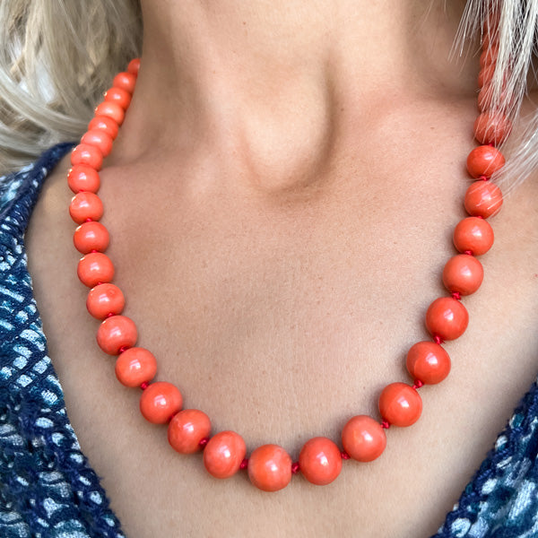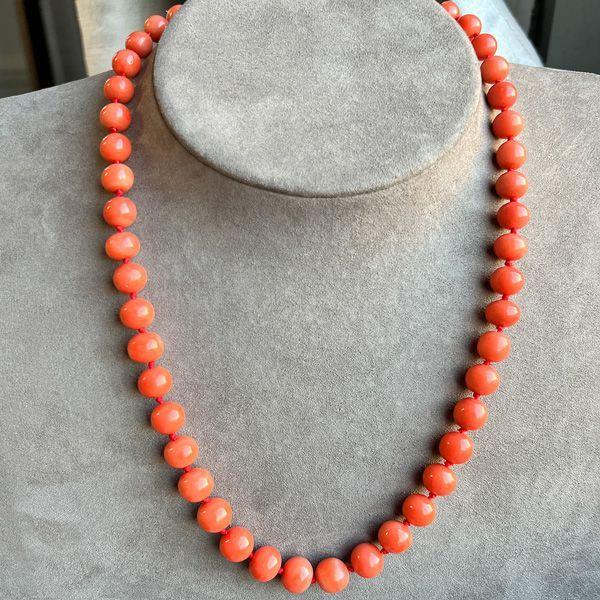 Coral beads ranging from approx. 8-10mm with filigree clasp fashioned in 14k yellow gold. Length 21 inches.