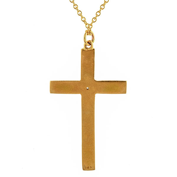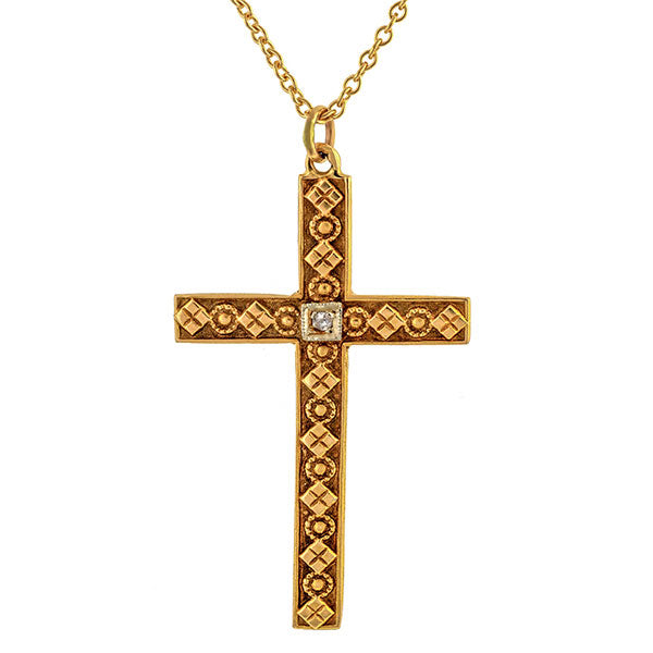 Measuring approx. 1 1/2 x 13/16, centering a Single cut diamond weighing approx. 0.01ct., suspended from 16 inch chain, fashioned in 14k white & yellow gold.