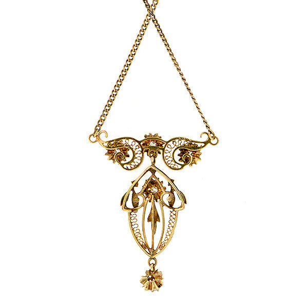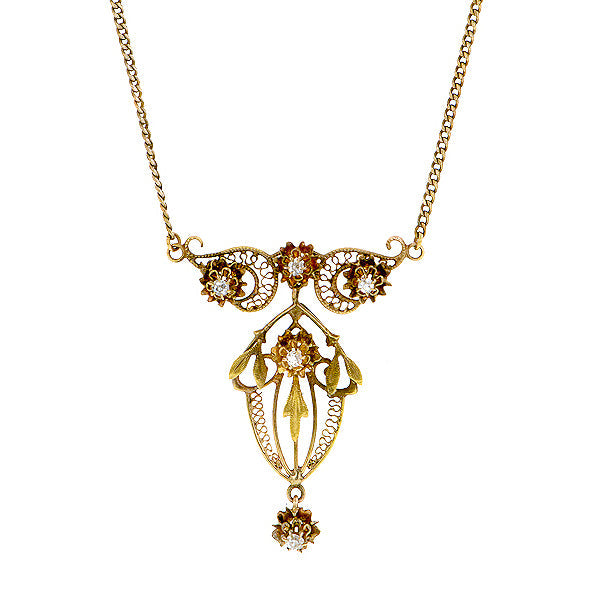 Set with five Single cut diamonds, weighing app. 0.15ct., fashioned in 10k yellow gold. Pendant length 1 inch, chain length 17 inches. Circa 1905.