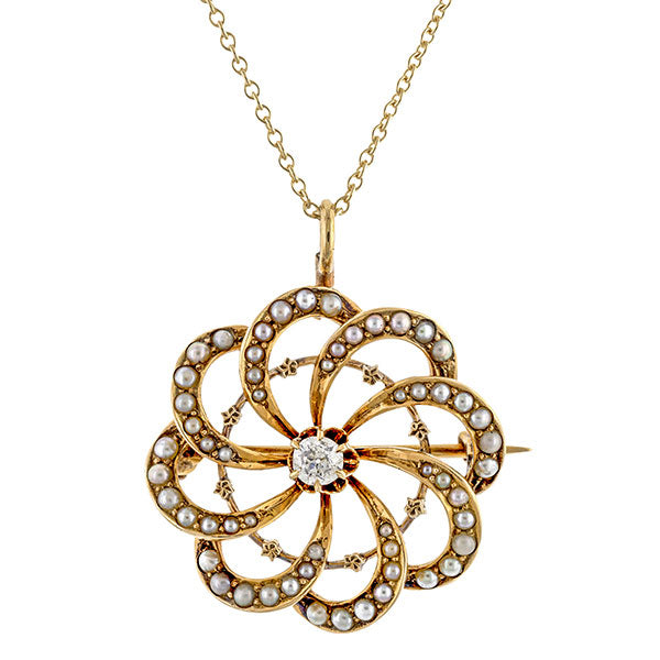 Centering an Old European cut diamond weighing approx. 0.20ct., framed by stars, and swirls set with half pearls ranging in size from 1-1.8mm., measuring approx. 1 1/4 x 1 inch, suspended from a 16-inch chain, fashioned in 14k yellow gold.