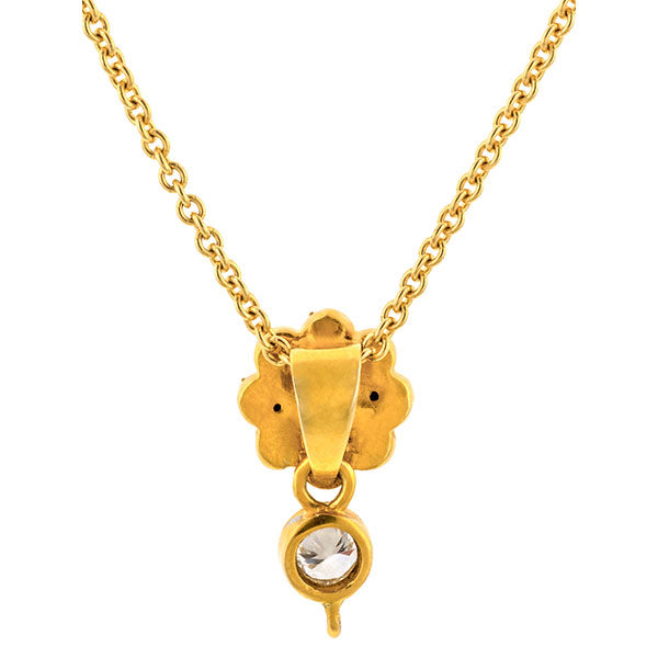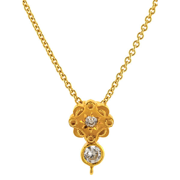 Centering an Old European cut diamond weighing approx. 0.05ctw., in an ornate gold work frame, suspending a bezel set diamond weighing approx. 0.15ct., fashioned in 18k yellow gold. Length 14 1/2.