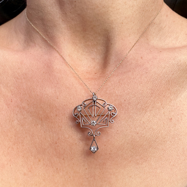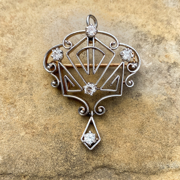 Measuring approx. 1 5/8 x 1 1/8 inch, set with five Round Brilliant cut diamonds weighing approx. 0.60ctw., fashioned in platinum-topped 14k yellow gold.