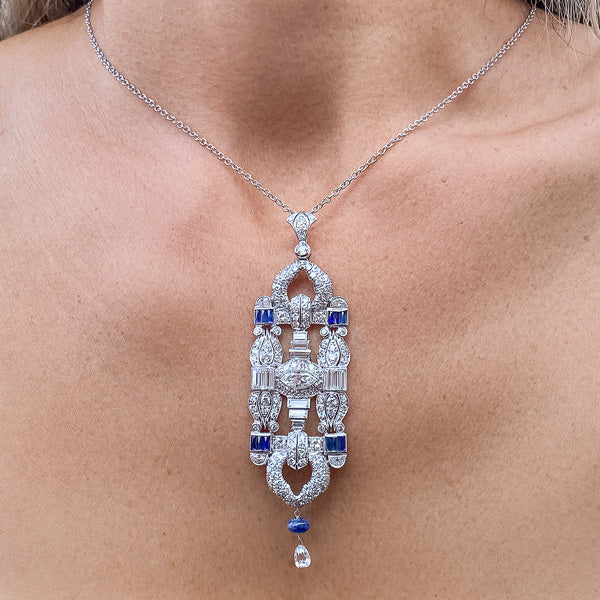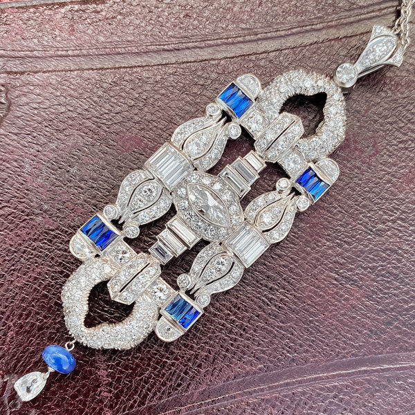 Measuring approx. 3 1/8 x 15/16 inch, centering a Marquise cut diamond weighing approx. 0.50ct., additionally set with twelve Baguette cut diamonds, four Half Moon cut diamonds and numerous Old European, Round Brilliant & Single cut diamonds weighing approx. 5.50ctw., and sapphires weighing approx. 1.50ctw., fashioned in platinum. On a contemporary platinum chain.