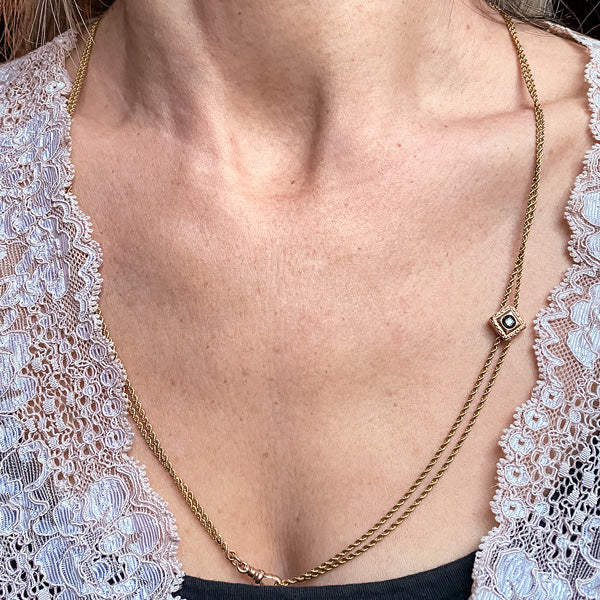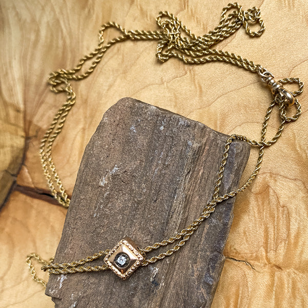 Rope chain with a square slide measuring approx. 8.7mm., centering a Single cut diamond weighing approx.0.04ct., fashioned in 14k gold. Stamped 14k. Maker's mark for Krementz. Length 50 inches.