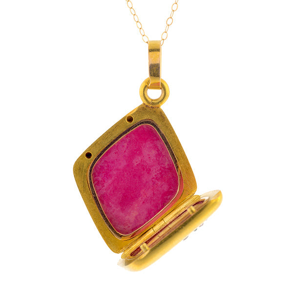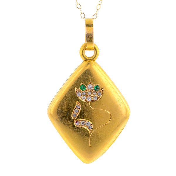 Measuring approx. 1 9/16 x 7/8 inch, set with two cabochon emeralds measuring approx. 1.5mm and sixteen Rose cut diamonds ranging in size from 1-1.5mm., depicting a flower, suspended from 18 inch 14k chain, fashioned in 15k yellow gold.