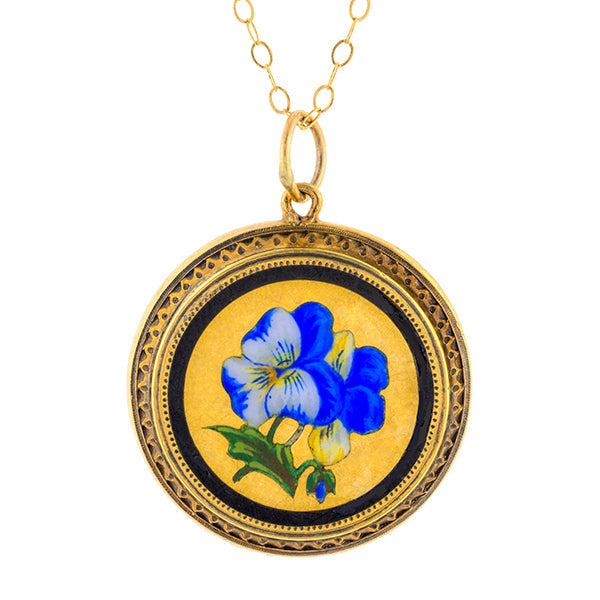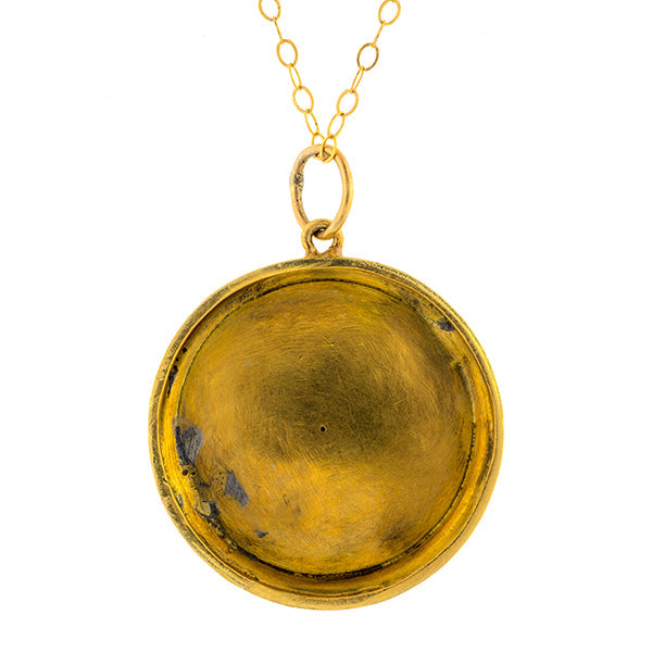 Measuring approx. 1 x 3/4 inch, suspended from a 16-inch chain, fashioned in 18k yellow gold.