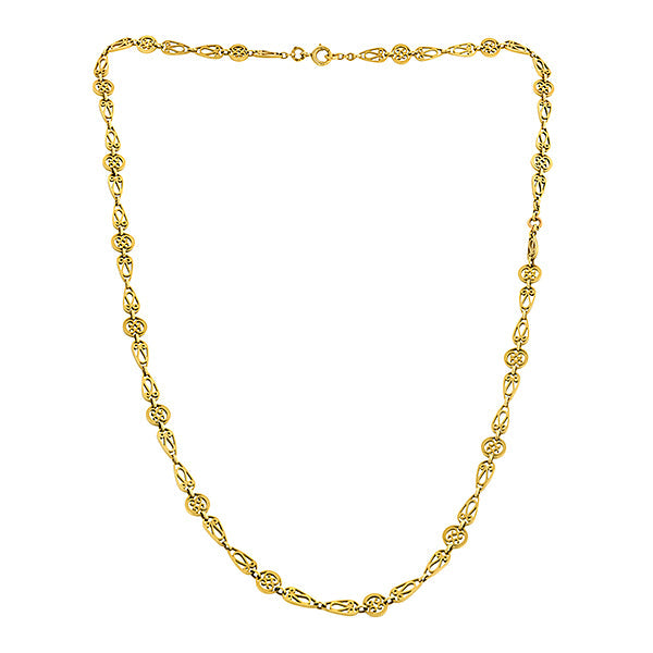 With pear and round, open work links with scroll motifs, fashioned in 18k. French. Circa 1880. Length 22 1/2 inches.
