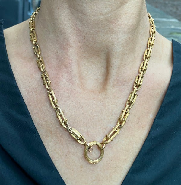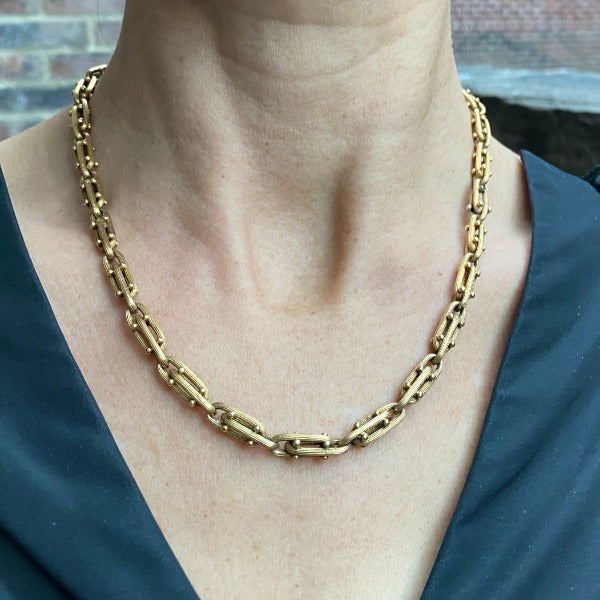 With decorative links measuring approx. 1/4 inch wide, fashioned in 14k yellow gold. Length 18 1/2 inches.