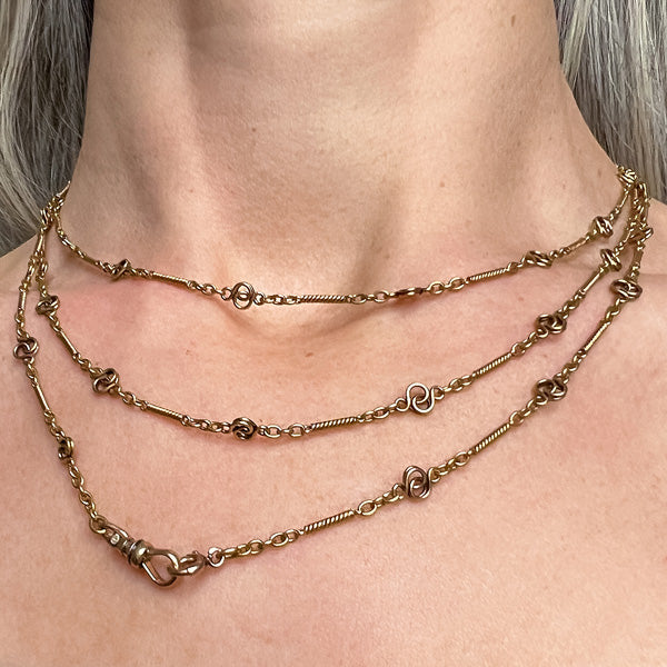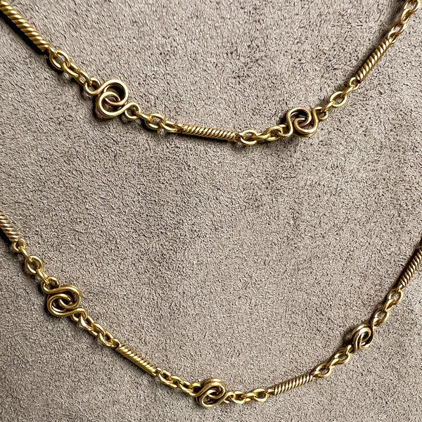 Measuring approx. 5mm wide, with fancy scrolling links alternating with twisted links, fashioned in 20k yellow gold. Length 52 inches.
