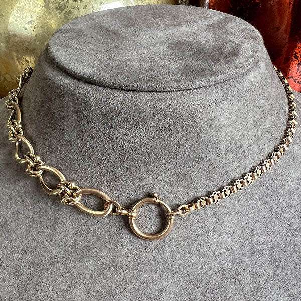 Comprised of two sections of differing fancy link chains. The wider chain is 9.3mm in width and 8 5/8 inches in length with large spring ring clasp. The narrower chain is 4.6mm in width and 5 1/8 inches in length with swivel dog clip clasp. Both fashioned in 14k rose gold. Total length 14 3/4 inches.