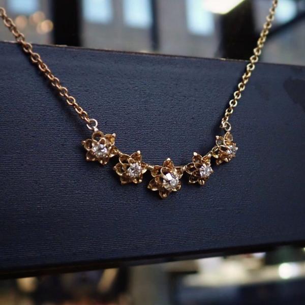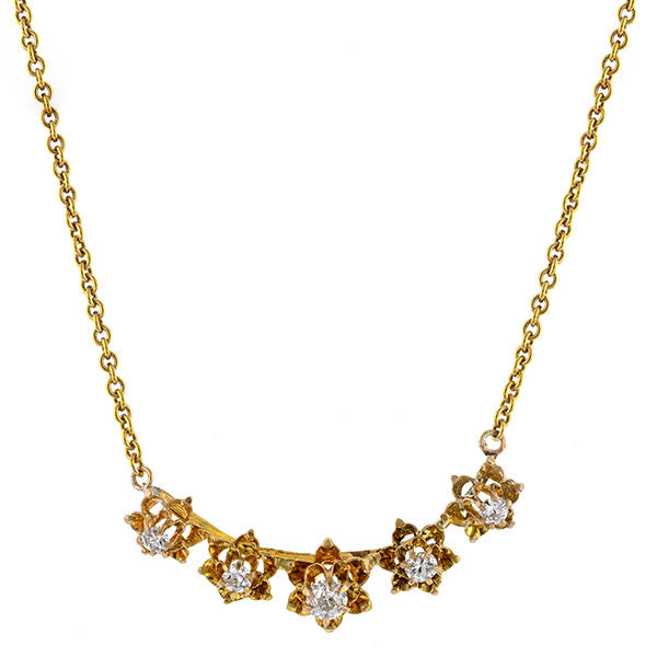 Centering an Old European cut diamond weighing approx. 0.15ct., additionally set with four Round Brilliant cut diamonds weighing approx. 0.20ctw. in a crescent shape, fashioned in 14k yellow gold. Length 15.5 inches.
