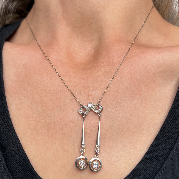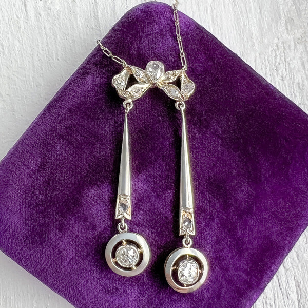 Topped with a bow set with an antique Pear shaped diamond weighing approx. 0.15ct., and six Old European cut diamonds weighing approx. 0.14ctw., with drops set with two Rose cut diamonds measuring approx. 2.5mm. and two Old European cut diamonds weighing approx. 0.45ctw., fashioned in platinum topped 18k yellow gold. French hallmarks.