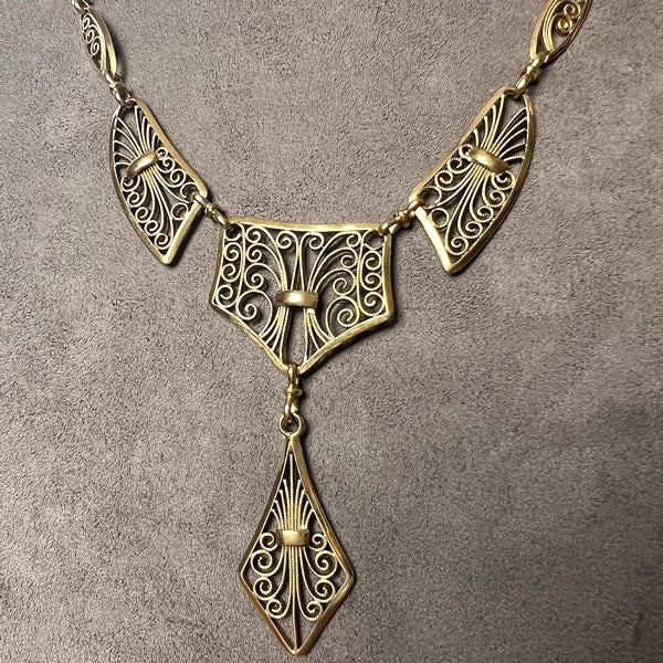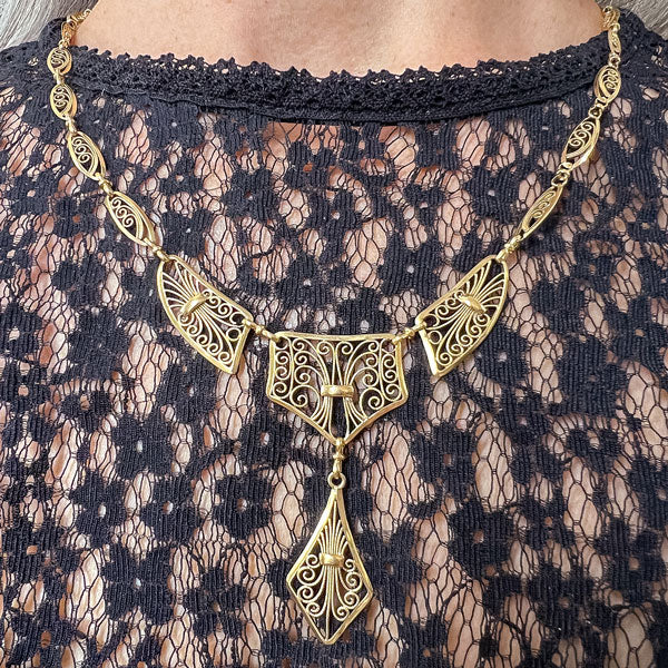 Designed with filigree links graduating at the center and suspending a filigree drop, fashioned in 18k yellow gold. Length 20 1/4 inches. French hallmarks.