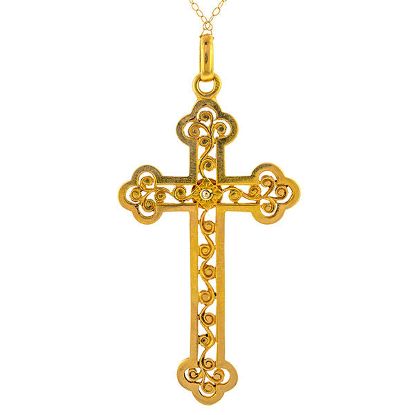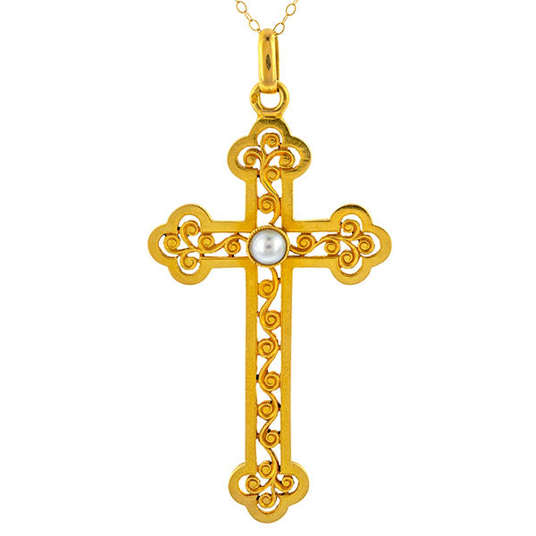 Measuring approx. 2 7/16 x 1 3/16 inches, centering a half pearl measuring approx. 5mm., suspended from 16 inch chain, fashioned in 18k yellow gold. French hallmarks.