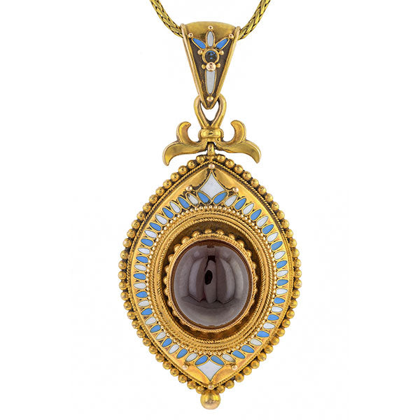 Centering an Oval garnet cabochon carbuncle measuring approx. 15 x 13mm., in a navette mounting with enamel & granulation embellishments, suspended from an ornate top & bail with coordinating enamel & granulation, fashioned in 14k yellow gold. Suspended from an antique chain measuring approx. 14 inches, fashioned in 14k yellow gold.