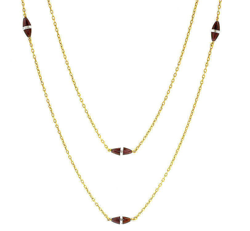 Station set with ten garnet rondelles with faceted crystal centers, fashioned in 18k yellow gold. Circa 1900. Length 52 inches.