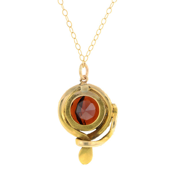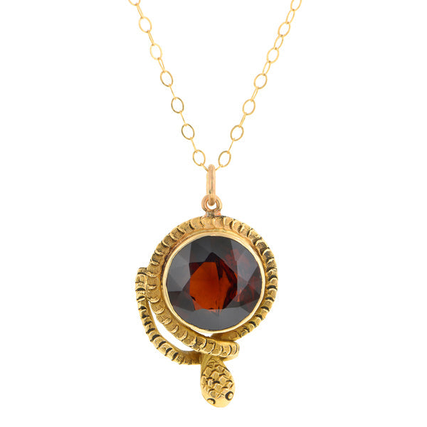 Measuring app. 7/8 (including bail) x 1/2 inch wide, featuring a round faceted garnet measuring app. 9.0mm, framed by an engraved, coiled snake, fashioned in 14k. Suspended from a 16 inch chain. Early 20th century.