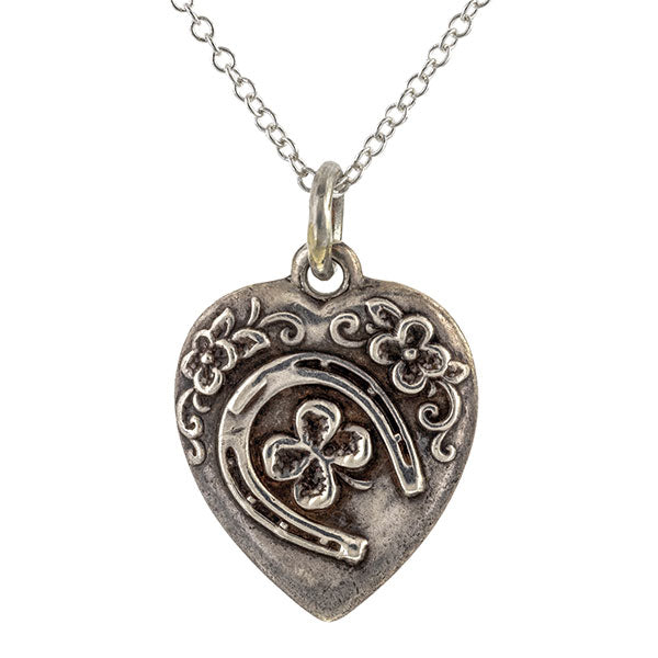 With a clover and horseshoe & floral motif, suspended from 16 inch chain, fashioned in sterling silver.