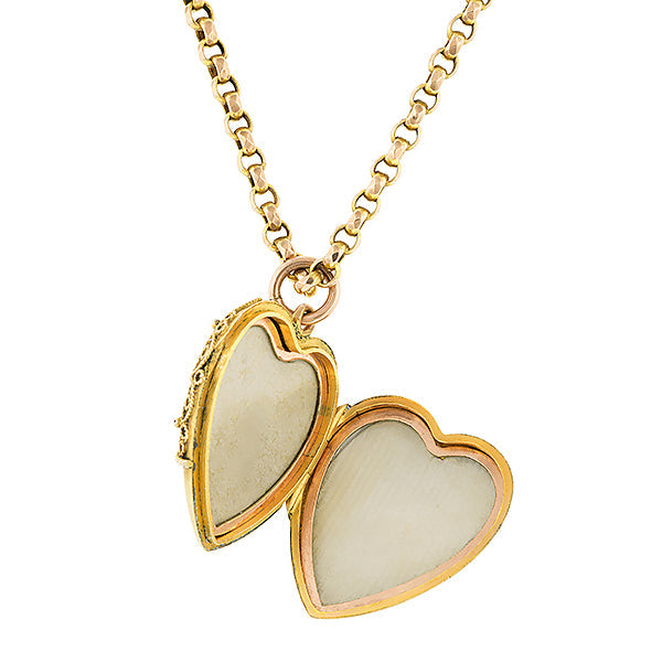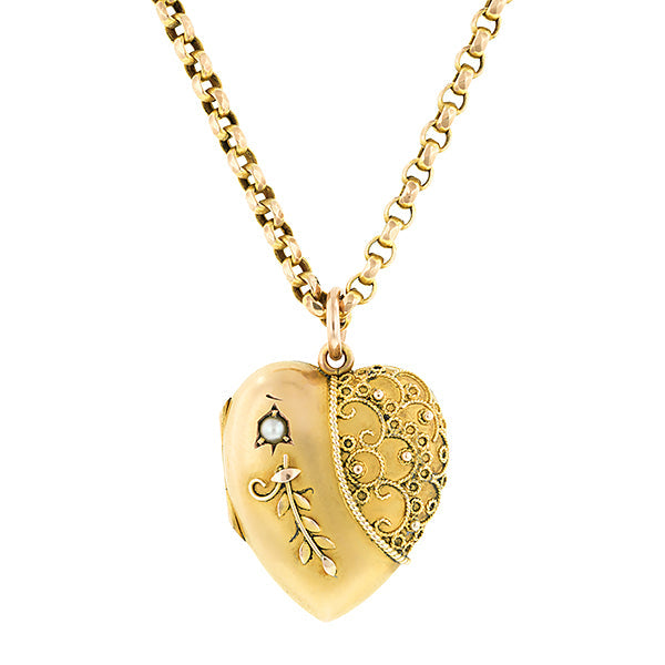 Measuring app. 1 1/8 (including bail) x 3/4 inch wide with applied wirework design set with a split pearl, suspended from a 17 3/4 inch belcher chain, all fashioned in 9k yellow gold. Circa 1905