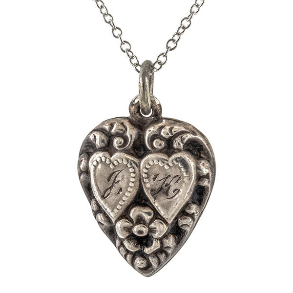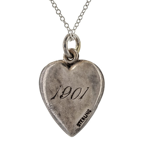 With two hearts engraved with a J & K, with a floral background, engraved on the back 1901, suspended from 16 inch chain, fashioned in sterling silver.
