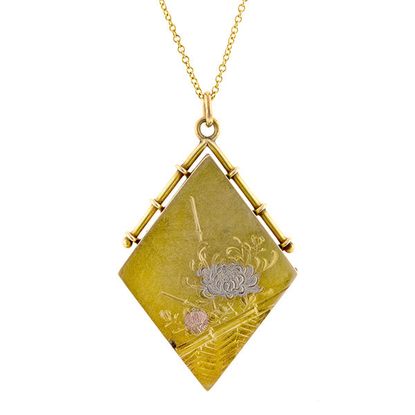 Measuring app. 1 1/16 (including bail) x 1 inch wide, with a tri-color gold chrysanthemum and bamboo motif and compass inside with Japanese characters, fashioned in 18k yellow gold. Suspended from an 18 inch chain. Japan. Unidentified maker's mark. Circa 1890.